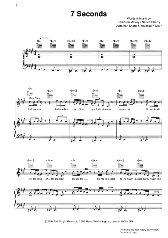7 Seconds Klavier, Gesang & Gitarre PDF Noten von Youssou N Dour in Fis Moll fbd27707