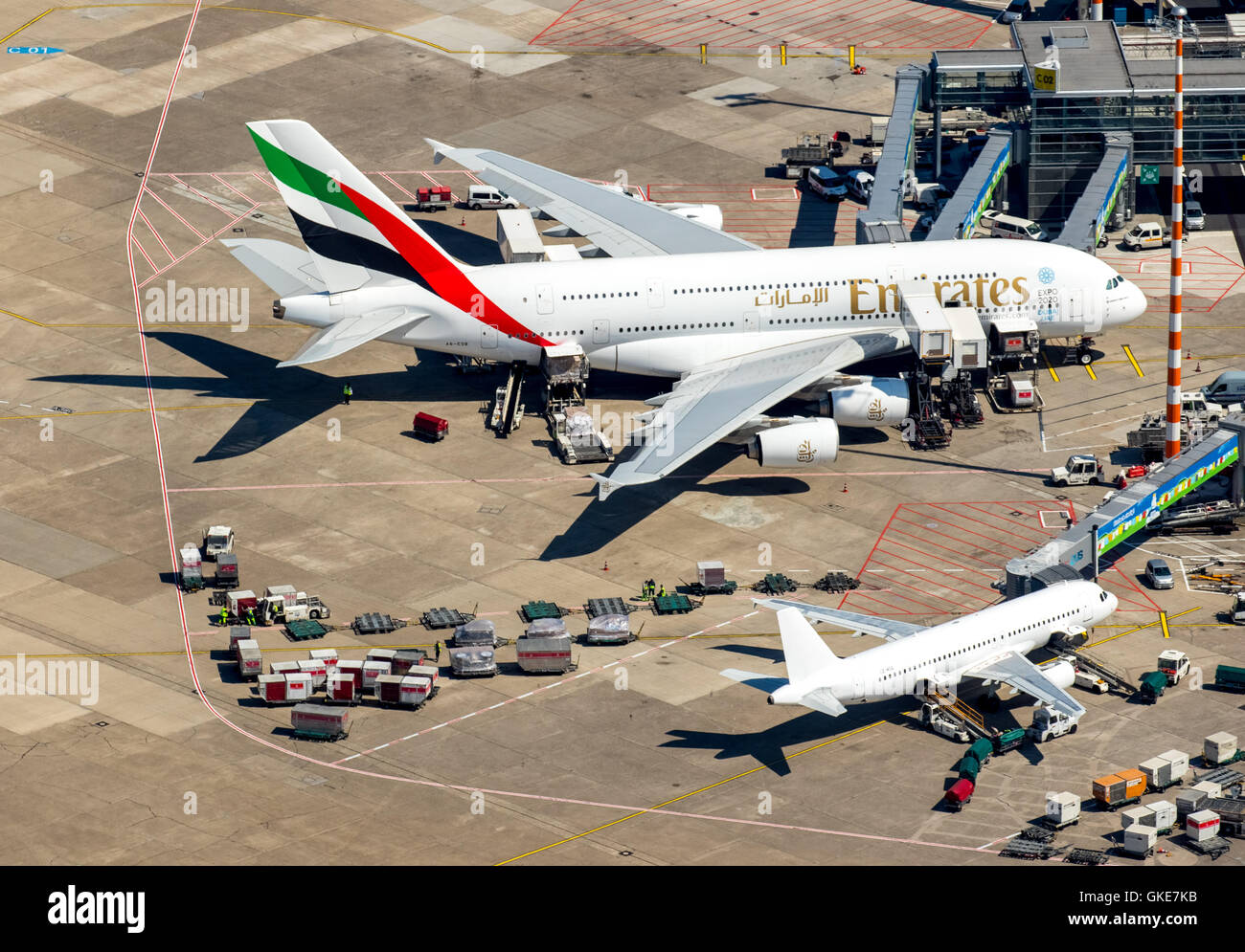 Vista aérea, Aeropuerto DusseldorfLohausen, A6EOB Emirates Airbus A380861, en la puerta, el