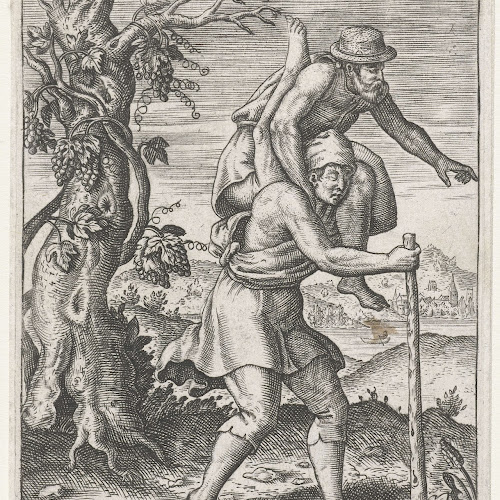 The 46th emblem from Johann Theodor de Bry's Emblemata saecularia with the theme of mutual support "The Blind Man and the Lame" is a fable that recounts how two individuals collaborate in an effort to overcome their respective disabilities.The theme is first attested in Greek about the first century BCE. Stories with this feature occur in Asia, Europe and North America.