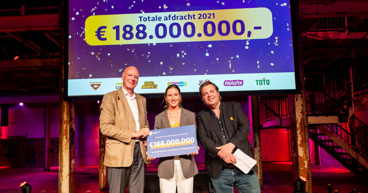 In totaal draagt Nederlandse Loterij over 2021 een recordbedrag van 188 miljoen euro aan afdrachten af: behalve het bedrag voor de sport, gaat het hierbij om 118,4 miljoen euro voor de Nederlandse Staat en 19,2 miljoen euro aan achttien verschillende goede doelen. Dat blijkt uit de jaarcijfers die Nederlandse Loterij heeft gepubliceerd.
