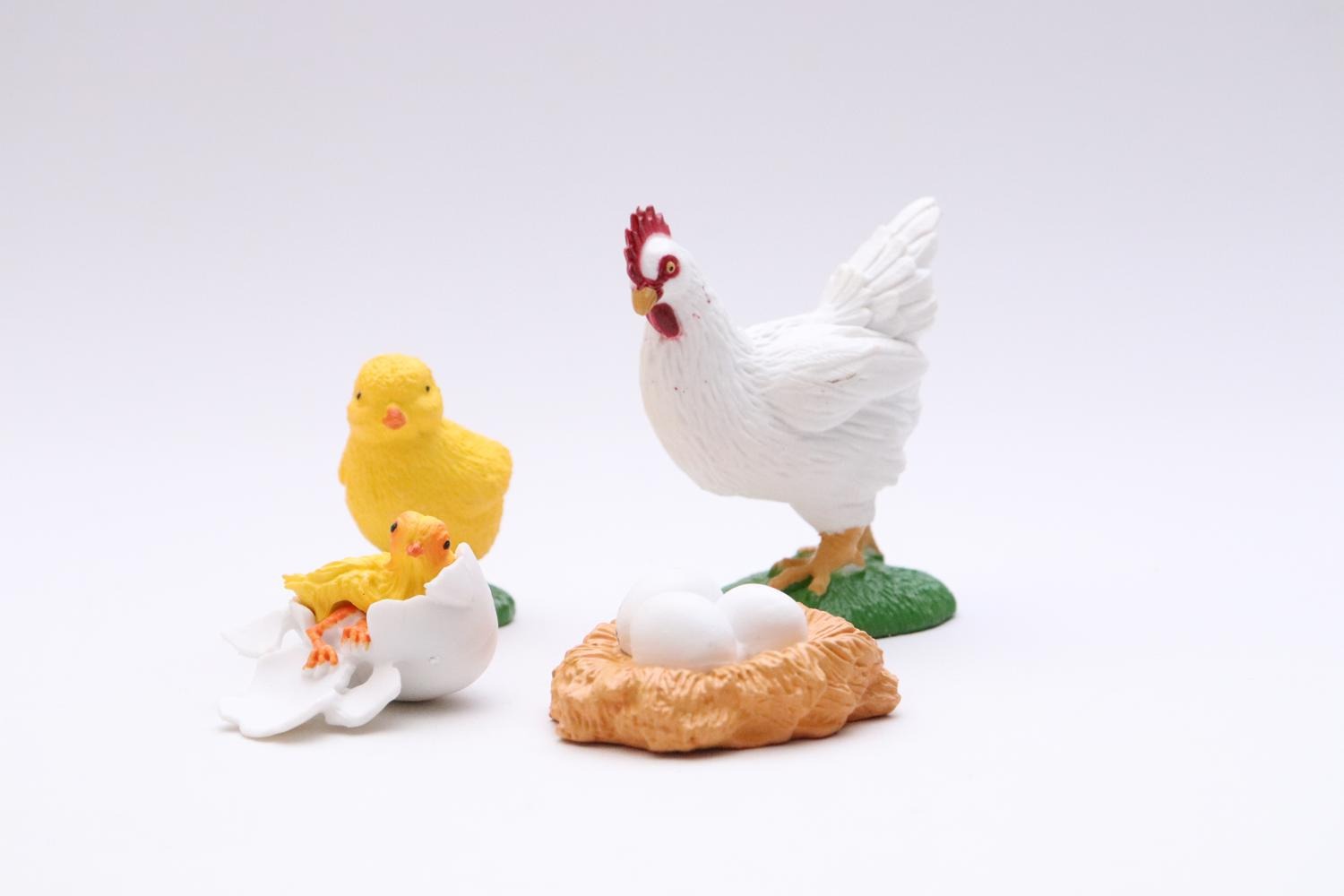 Deze levensechte, zachte figuren tonen de vier fases van de levenscyclus van de kip. Eerst legt de kip eieren in het nest. Uit een ei komt een kuiken, dat dan uitgroeit tot een kip. Met deze leuke figuurtjes leer je heel simpel de levenscyclus.