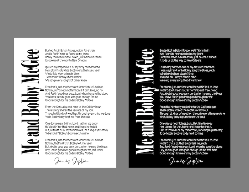 I was holdin' Bobby's hand in mine. We sang every song that driver knew. Freedom's just another word for nothin' left to lose. Nothin' ain't worth nothin' but it's free. Feelin' good was easy, Lord, When he sang the blues. And feelin' good was good enough for me. Good enough for me and Bobby McGee.