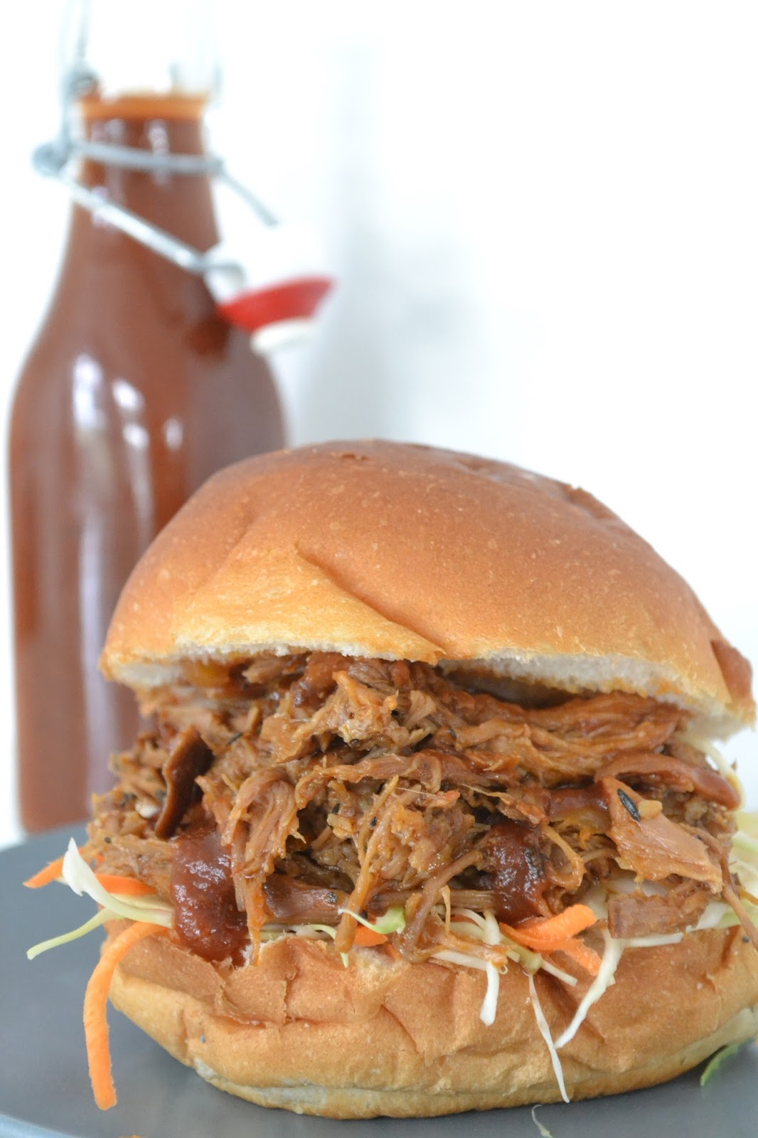To make this with store bought BBQ sauce, you will need 650ml / 22 oz barbecue sauce of choice. Add 1 cup of pork juices per recipe, then simmer on medium high for 30 minutes or until thickened, stirring regularly. 6. 1.5 kg / 3 lb pork shoulder makes enough for 6 large or 8 normal sized sandwiches.