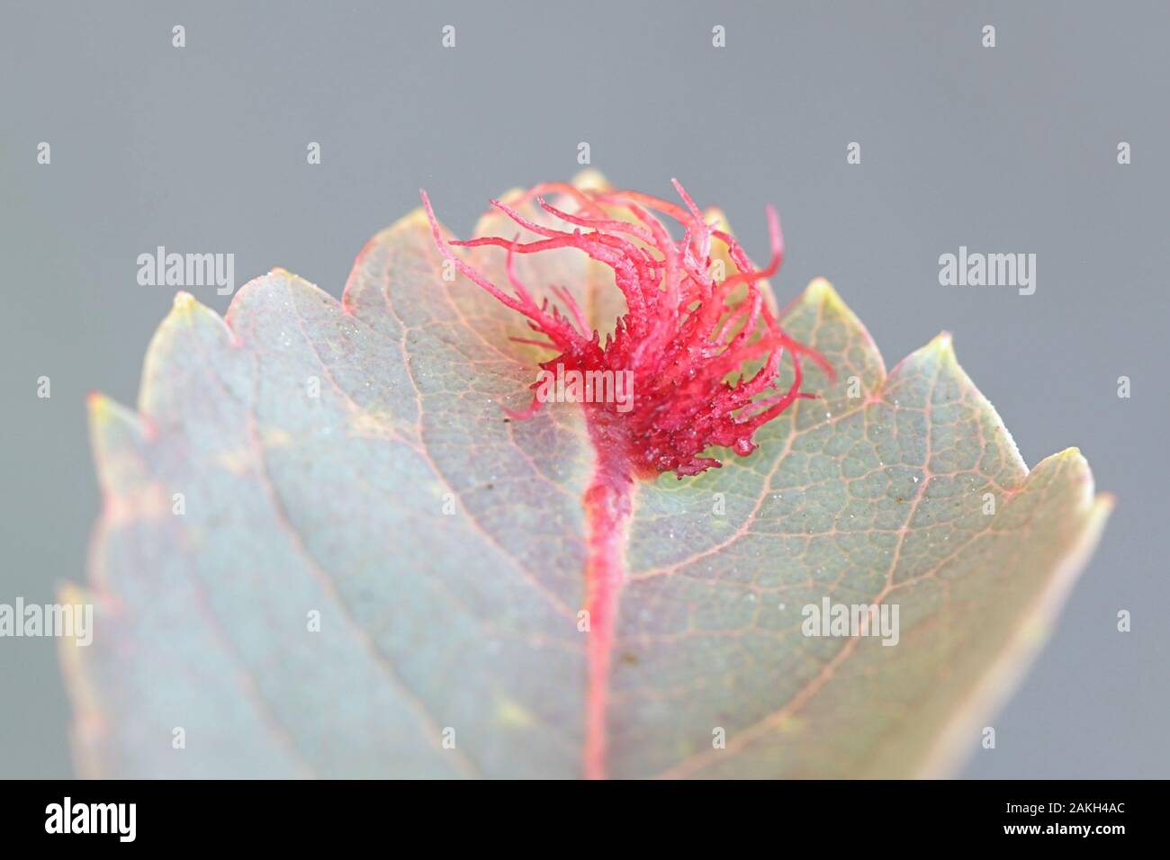 Red gall in wild rose, Rosa glauca, infected with rose gall wasp, Diplolepis rosae. The gall is