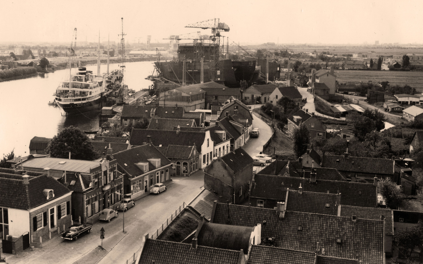 Luchtfoto van de scheepswerf van Van der Giessen in Krimpen ad IJssel (1920-1940). C van der Giessen & Zonen was een Nederlandse scheepswerf in Krimpen aan den IJssel die in 1962 opging in Van der Giessen-de Noord.. De geschiedenis van Van der Giessen gaat terug tot 1820, toen Arie van der Giessen een geërfde scheepstimmerwerf in Krimpen aan den IJssel uitbreidde tot scheepswerf.