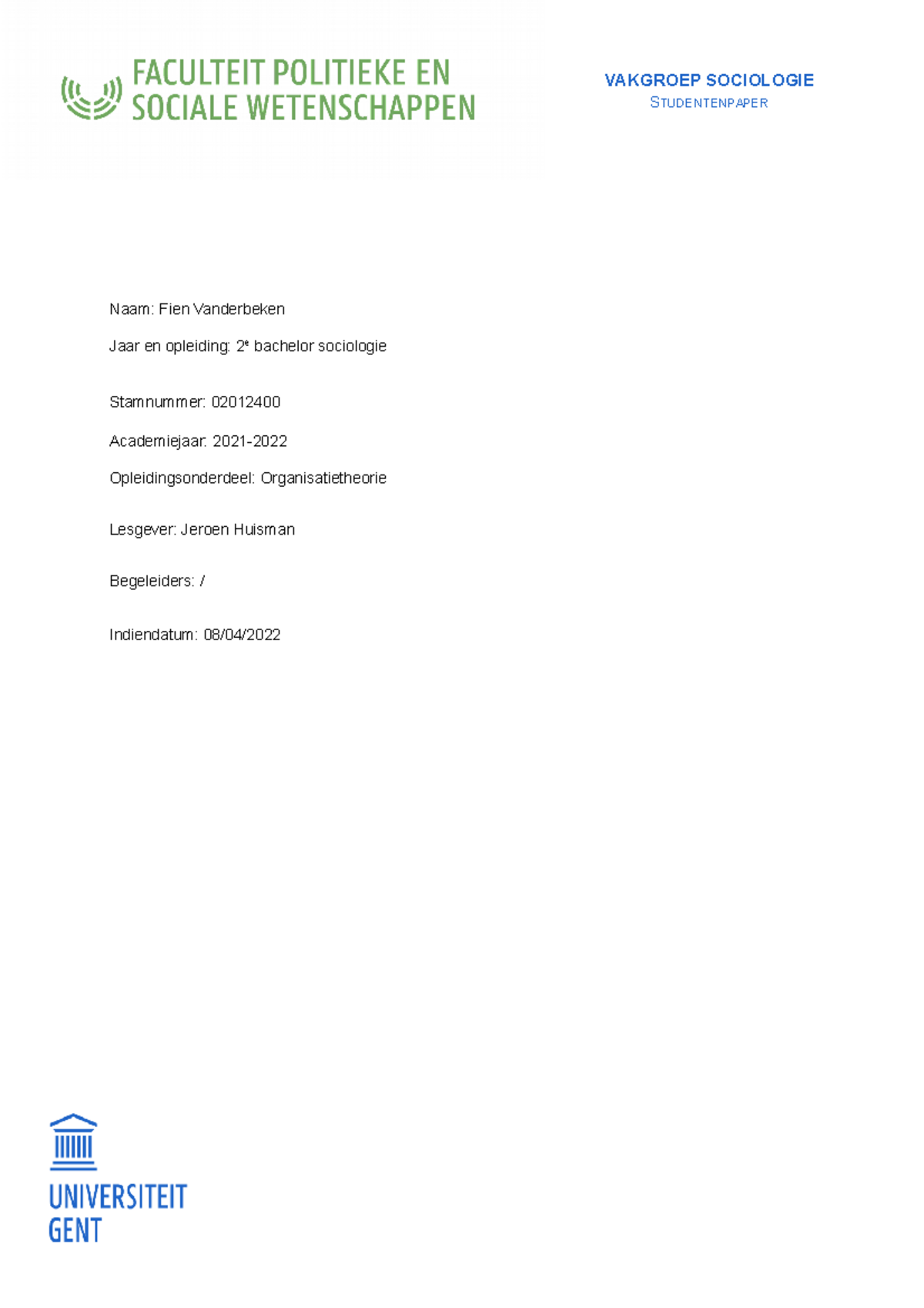 Paper organisatietheorie Fien Vanderbeken Naam Fien Vanderbeken Jaar en opleiding 2e