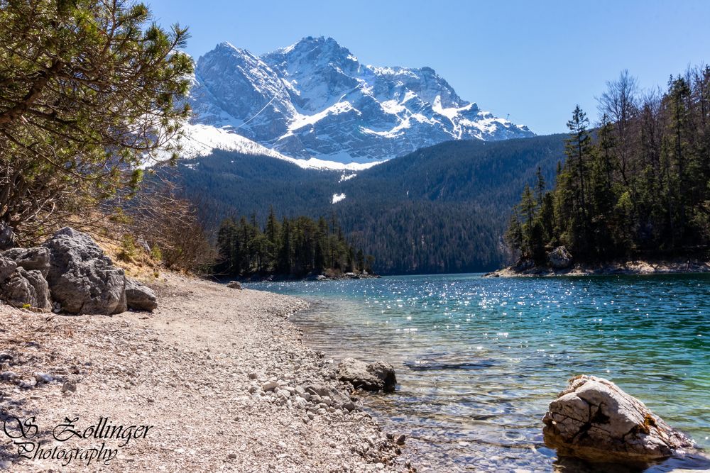 Eibsee in Beieren. Dat de Eibsee minder bekend is dan de andere meren zou je niet zeggen als je er rond loopt. Het is er ontzettend druk! Dit komt niet zo zeer door de Eibsee zelf, maar door de Zugspitze die er naast ligt. De Zugspitze is met een hoogte van 2962 meter de hoogste berg van Duitsland. De Eibsee ligt op een hoogte van bijna 1000 meter onderaan de berg, op 8 kilometer afstand van.