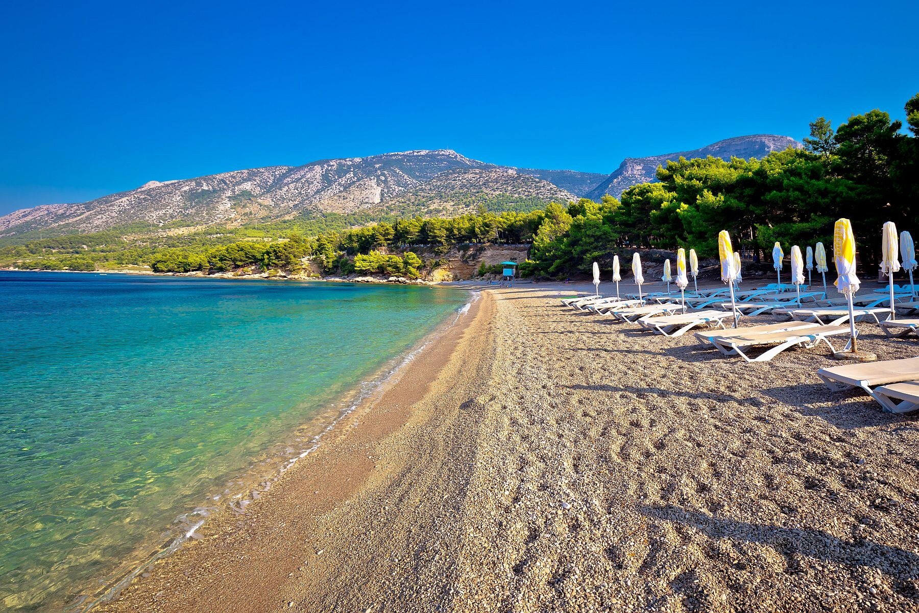Zlatni Rat. Zlatni Rat, Croatia's most photographed beach, extends like a tongue into the sea for about a quarter of a mile (400m). Despite the hype and constant crowds, the "golden cape" is a gorgeous place. Made up of smooth white pebbles, its elegant tip is constantly shuffled by the wind and waves. Pine trees provide shade and rocky cliffs.